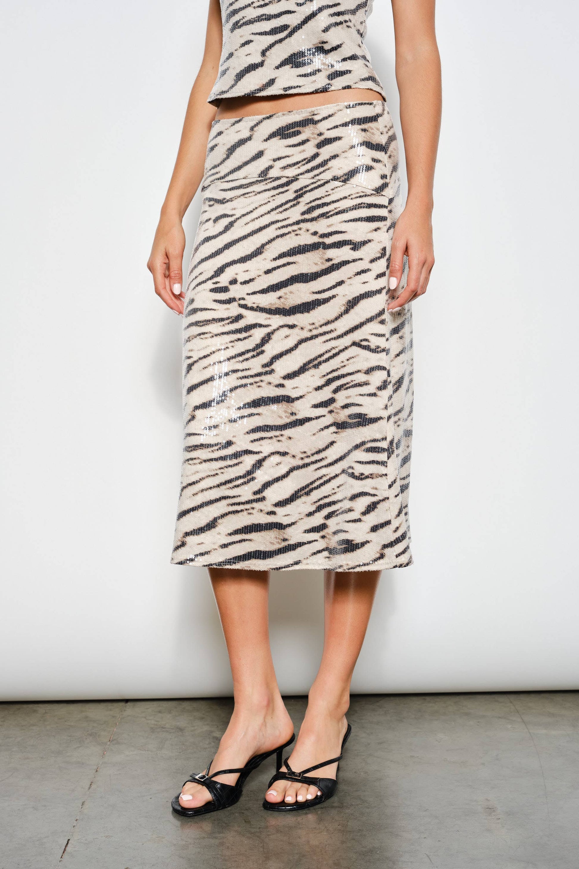 Shine bright in the Madelyn Zebra Sequin Midi Skirt—a sparkly showstopper. The elasticized waistband ensures a comfortable fit, while the fully lined interior keeps it smooth and easy to wear all night long. Pairs perfectly with the Madelyn zebra tank!