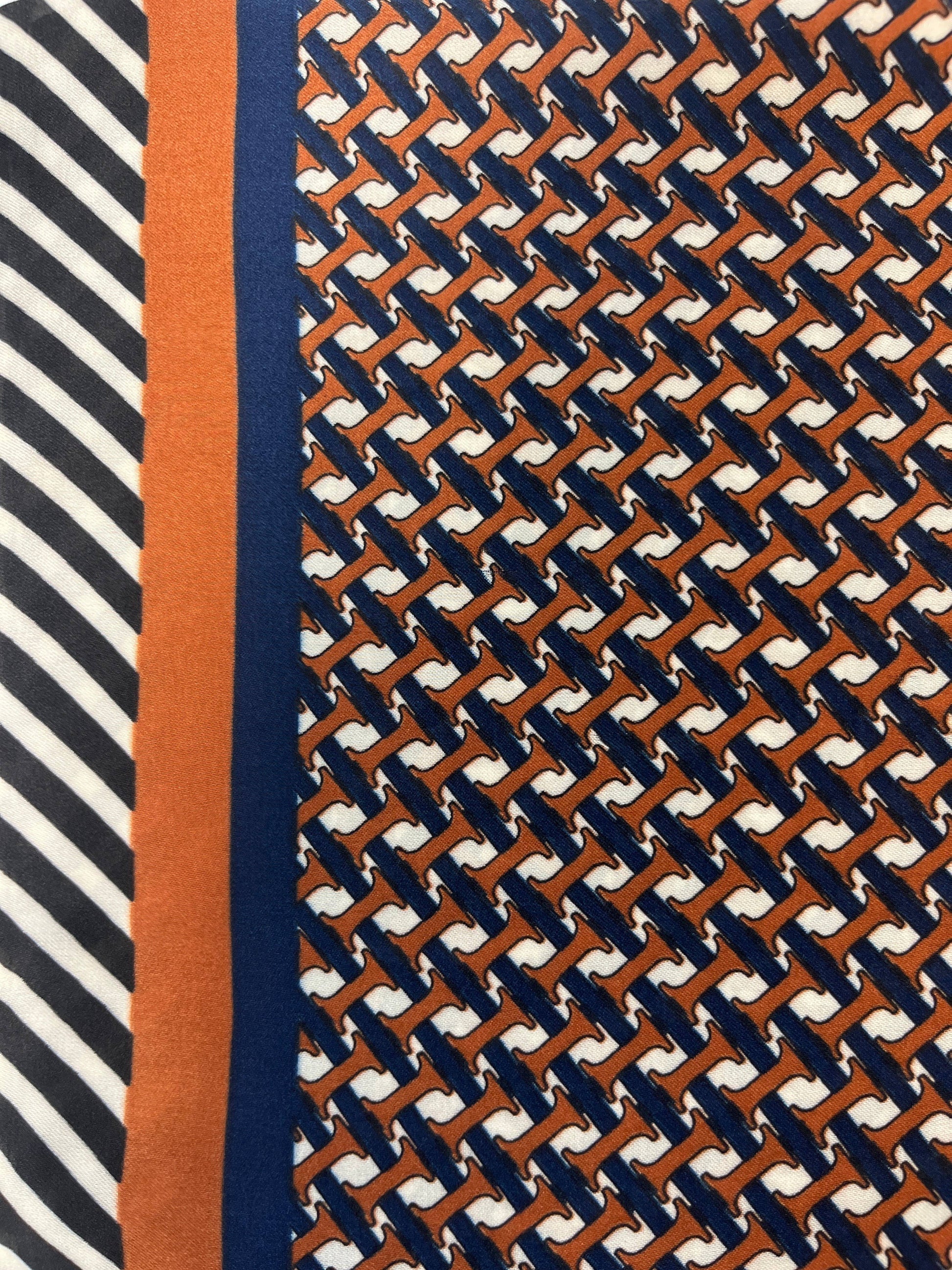 A vibrant geometric pattern featuring intricate, interlocking lines. Dimensions: 27 x 27 inches